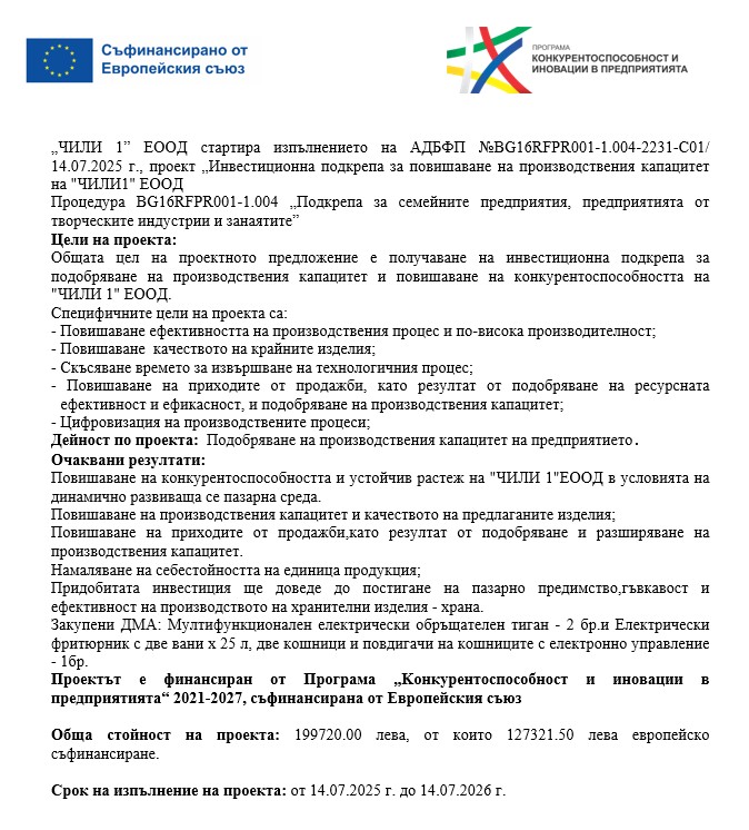 Заведение за бързо хранене "ЧИЛИ" отвори врати на 29.12.2008 г. с концепцията да предложи на своите клиенти един съвсем нов начин на живот посредством качествено, уравновесено и здравословно хранене. Зад тези силни думи се крият няколко основни фактора, които ни утвърдиха във времето чрез все по-големият брой редовни клиенти, които ни се доверяват ежедневно, а ние им отвръщаме с качество и постоянство. За да постигнем максимално качествена и здравословна храна, ние заложихме на съвсем иновативна немска технология за приготвянето на ястията посредством пара в конвектомати последно поколение, на изключително добре подговеният екип и не на последно място на постоянно използваните пресни и охладени български продукти.