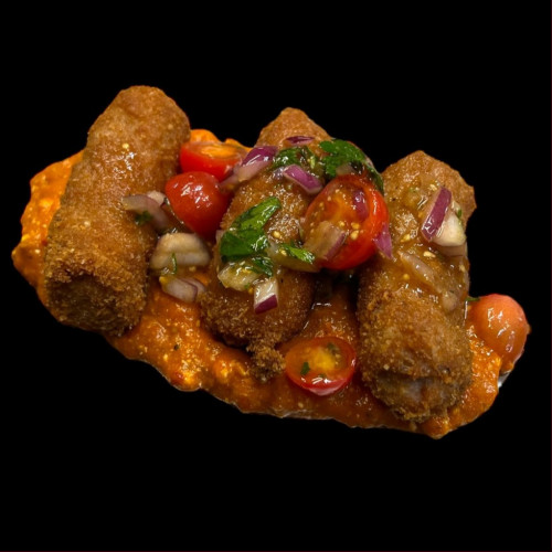 Телешки кебапчета върху канапе от кълцани печени зеленчуци и чери домати конкасе